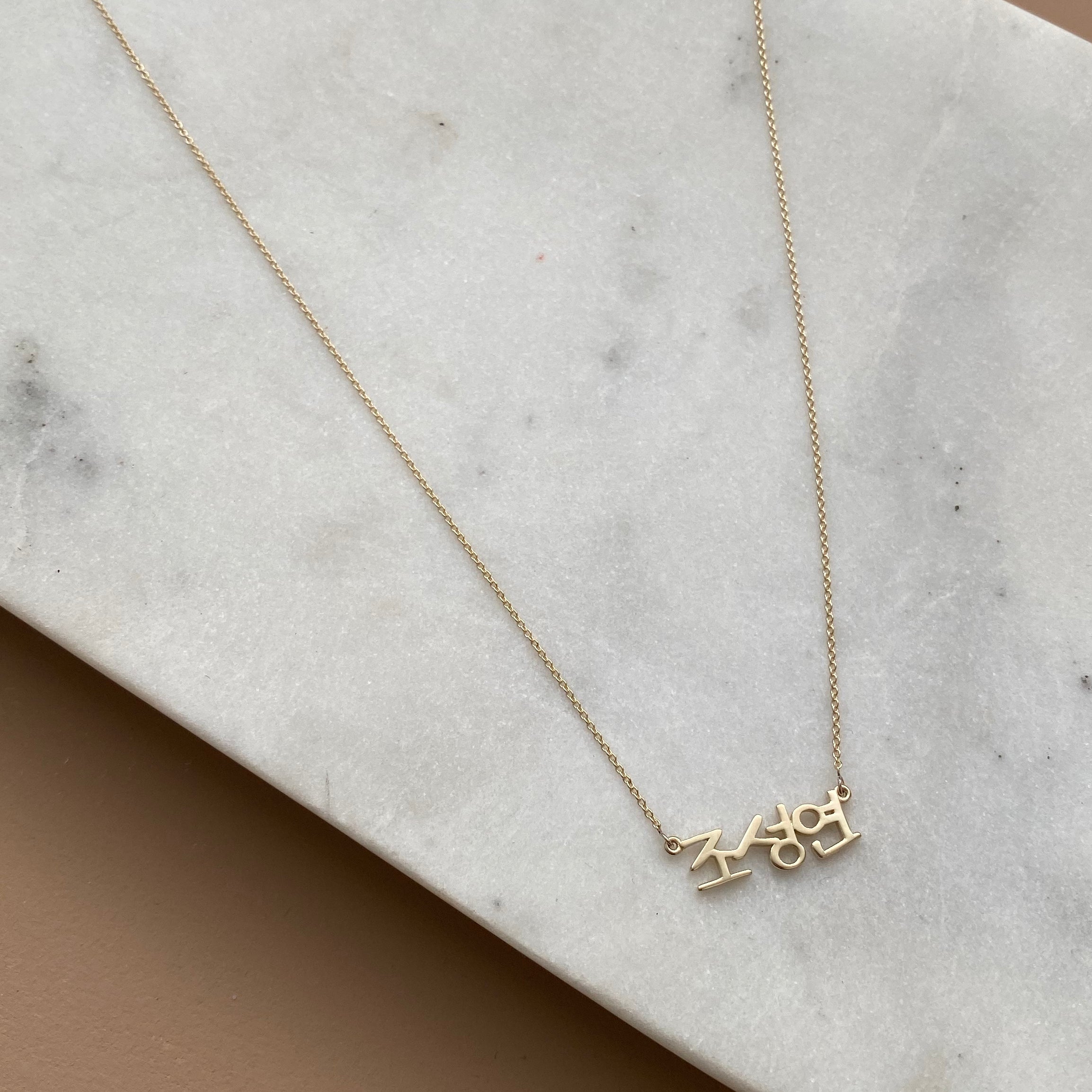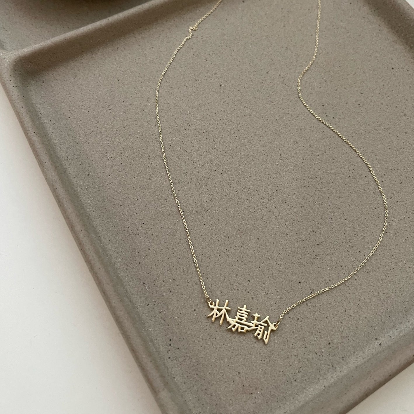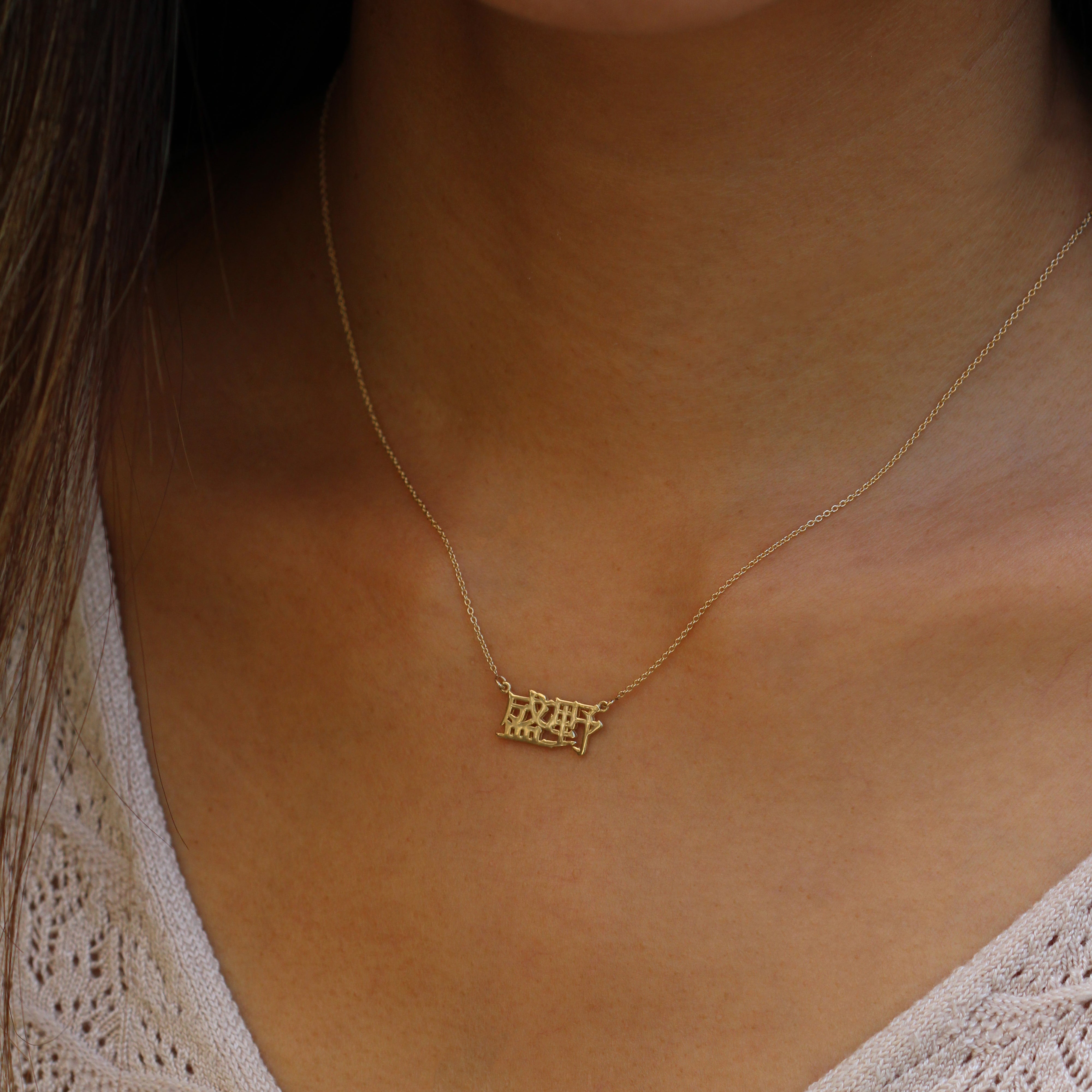 Celebrate your heritage with our 14K solid gold Custom Heritage Mini Love Letter Name Necklace. This delicate and timeless piece features beautifully crafted Korean, Chinese, or Japanese characters, allowing you to personalize it with your name or the name of a loved one.